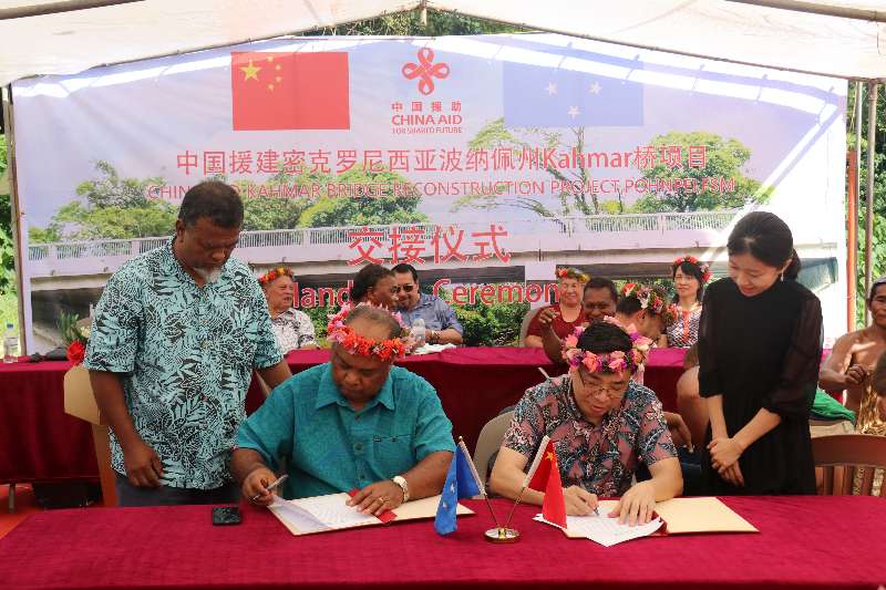 2020年8月20日,驻密联邦使馆经商事务临时负责人李佼陪同黄峥大使夫妇出席援波纳佩州卡玛桥危桥改造项目交接仪式。密联邦副总统乔治夫妇等政要出席。
